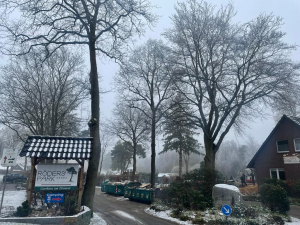 Man sieht zwar auch oben schon, dass die Bäume noch alle stehen, aber hier noch mal ein Bild für alle, die sich so lieb um die Bäume sorgten: Das war, als die Container noch standen. Die Baustelle ist neben dem rechten Baum und dem Haus klein zu erkennen.